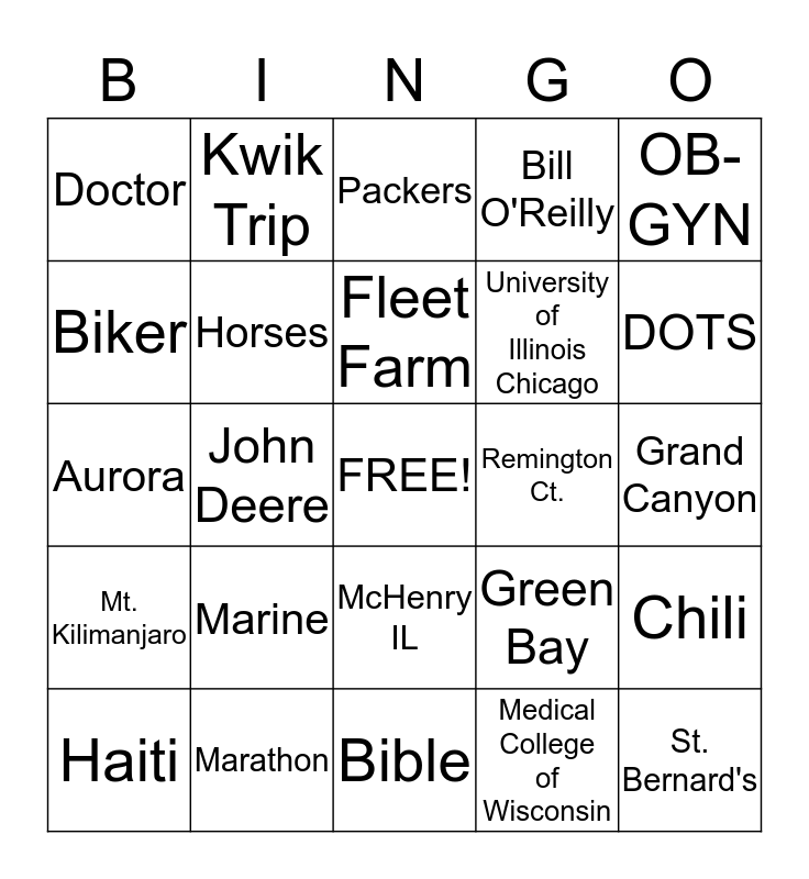 This bingo card has a free space and 24 words: Marine, Marathon, Fleet Farm, Haiti, OB-GYN, Doctor, Biker, Kwik Trip, Remington Ct., McHenry IL, University of Illinois Chicago, Aurora, Green Bay, Chili, Horses, Medical College of Wisconsin, Grand Canyon, Packers, DOTS, John Deere, St. Bernard's, Mt. Kilimanjaro, Bill O'Reilly and Bible.