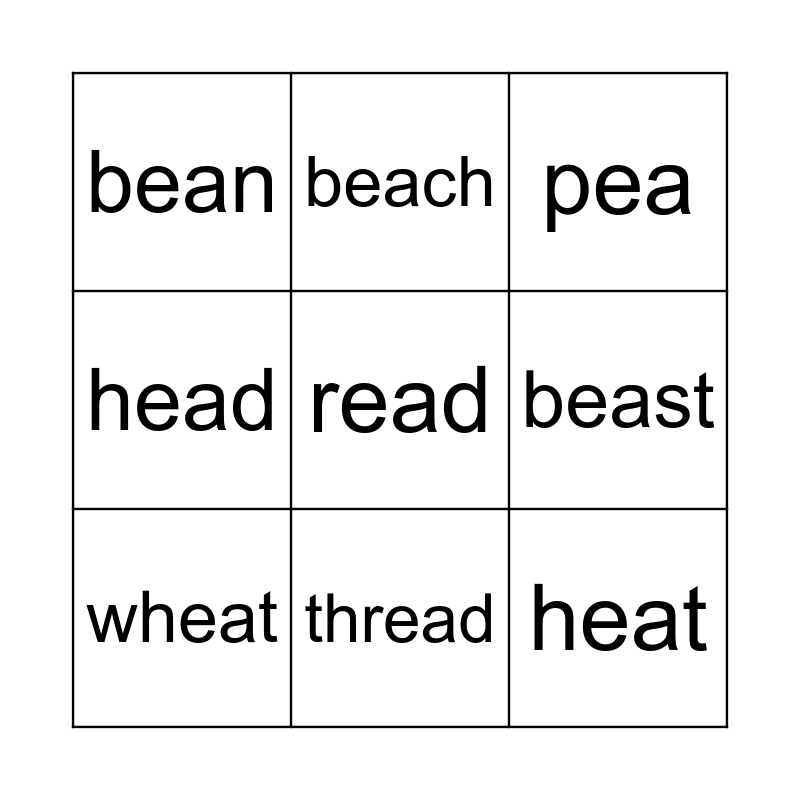 This bingo card has 20 words: tea, leaf, pea, seat, meal, read, speak, bean, heat, beach, teacher, please, beast, dream, wheat, bread, thread, head, feather and eat.