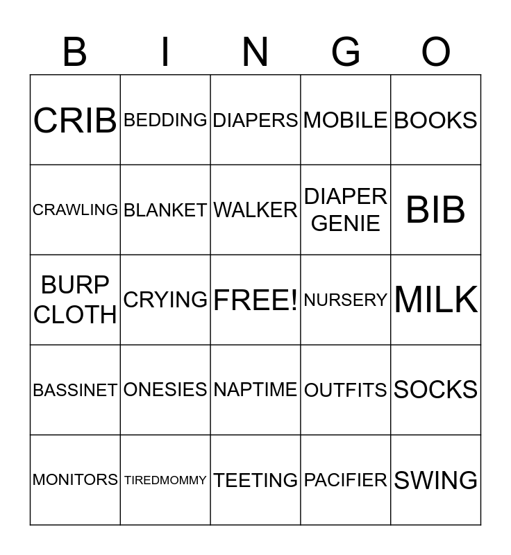 This bingo card has a free space and 29 words: MONITORS, PEDIATRICIAN, CRYING, RATTLE, CRIB, DIAPERS, BLANKET, ONESIES, NURSERY, TIREDMOMMY, MILK, SWING, TEETING, PACIFIER, BIB, PLAYPEN, NAPTIME, BASSINET, BOOKS, BURP CLOTH, OUTFITS, BOTTLE, DIAPER GENIE, CRAWLING, MOBILE, BEDDING, SOCKS, WALKER and FUSSY.