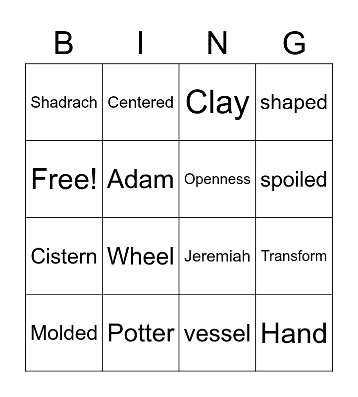 This bingo card has 16 words: Potter, Transform, Clay, Shadrach, Cistern, Centered, Jeremiah, vessel, Free!, Adam, Molded, shaped, Wheel, spoiled, Openness and Hand.