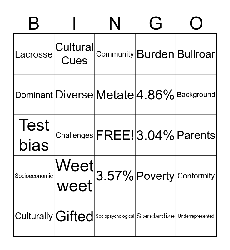 This bingo card has a free space and 24 words: Weet weet, Gifted, Metate, Culturally, Bullroar, Lacrosse, Dominant, Cultural Cues, 3.04%, 3.57%, 4.86%, Test bias, Poverty, Conformity, Diverse, Standardize, Parents, Community, Background, Challenges, Underrepresented, Socioeconomic, Burden and Sociopsychological.