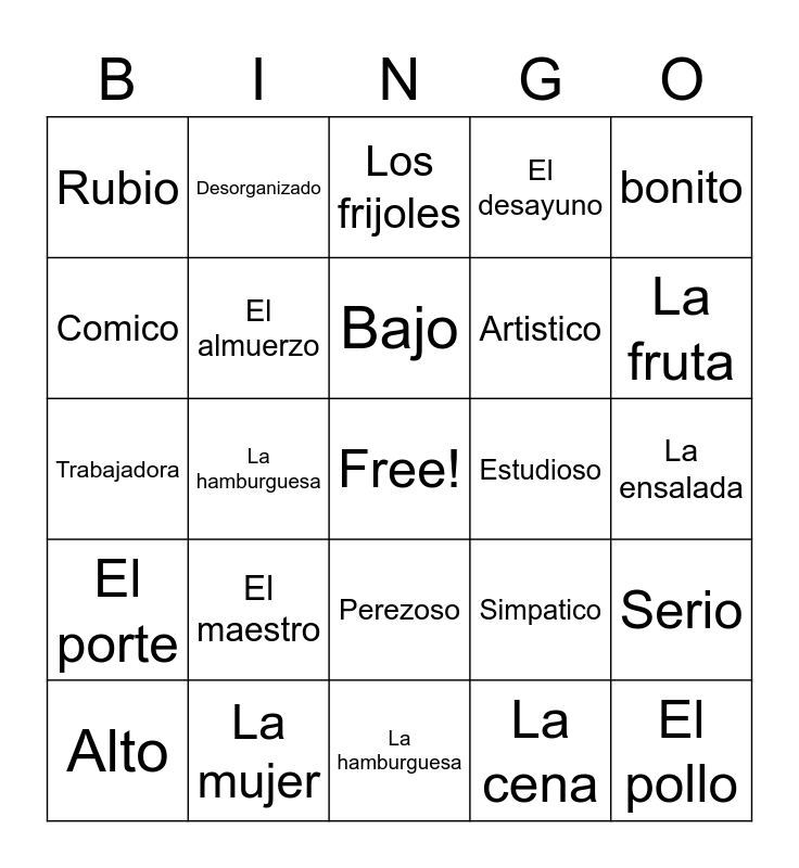 This bingo card has a free space and 24 words: El maestro, La mujer, Bajo, Alto, bonito, Rubio, Comico, Desorganizado, Estudioso, Perezoso, Artistico, Trabajadora, Simpatico, Serio, El almuerzo, La cena, La ensalada, Los frijoles, La fruta, La hamburguesa, El pollo, El porte, El desayuno and La hamburguesa.
