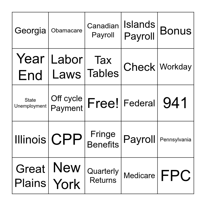 This bingo card has a free space and 90 words: Vacation Pay, Garnishments, Fringe Benefits, 401K, Non-Qualified, Gross, Net, IRS, SSA, DOL, Continued Education, Webinars, APA, 941, 940, Tax Tables, Percentage Method, Tax Bracket, April 15, January 31, Estimated Tax Deposits, Monthly Returns, Quarterly Returns, Federal Unemployment, State Unemployment, New York, New Jersey, Indiana, Kentucky, California, Iowa, Pennsylvania, Texas, Illinois, Georgia, Islands Payroll, Canadian Payroll, US Payroll, Off cycle Payment, Workday, Great Plains, Year End, Affordable Care Act, FMLA, District of Columbia, Payroll, Pay, Money, Wages, Dollars, Direct Deposit, Check, Payday, Semi-monthly, Weekly, Monthly, Federal, State, Local, Taxes, Withholding, Deductions, Benefits, Pre-tax, After Tax, FICA, Social Security, Medicare, Employee Portion, Employer Portion, CPP, FPC, Provencial Tax, FLSA, Obamacare, Labor Laws, Overtime, Exempt, Non-Exempt, Holiday Pay, Regular, Bonus, Shift Pay, 40 hour work week, W2, W2-C, W4, I9, Short-term Disability and Long term disability.