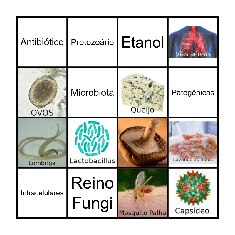 This bingo card has 13 images and 11 words: Patogênicas, Vírus, Antibiótico, Microbiota, Protozoário, Reino Fungi, Probióticos, Bactéria, Intoxicação alimentar, Etanol and Intracelulares.