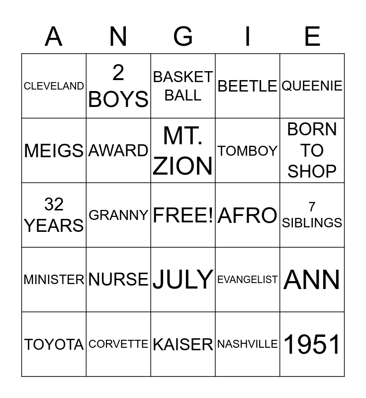 This bingo card has a free space and 24 words: NURSE, CORVETTE, MT. ZION, TOYOTA, QUEENIE, CLEVELAND, MEIGS, 2 BOYS, AFRO, JULY, TOMBOY, 32 YEARS, EVANGELIST, ANN, AWARD, NASHVILLE, 7 SIBLINGS, BASKET BALL, BORN TO SHOP, GRANNY, 1951, MINISTER, BEETLE and KAISER.