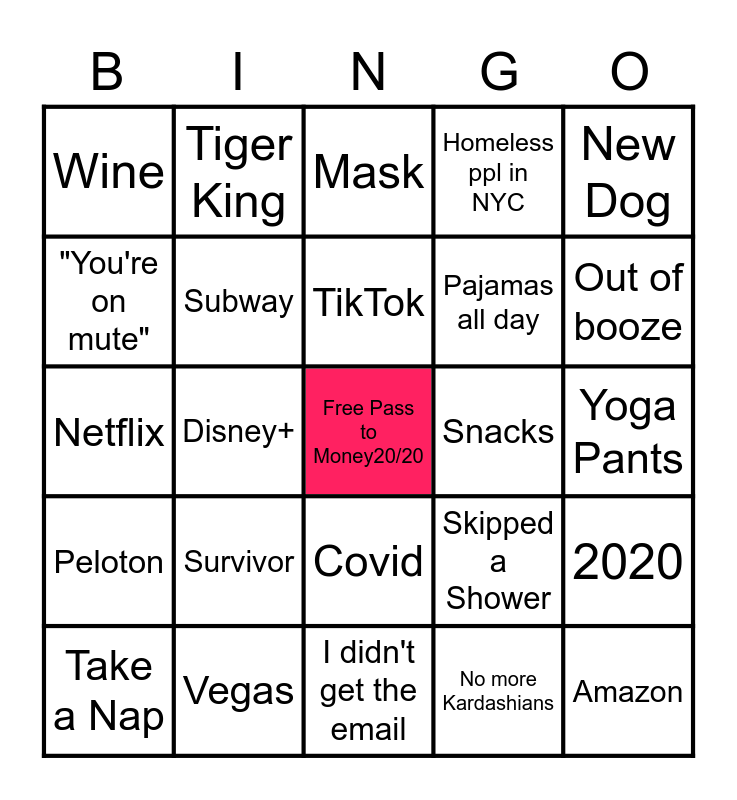 This bingo card has a free space and 24 words: Survivor, Vegas, TikTok, Take a Nap, New Dog, Wine, "You're on mute", Tiger King, Snacks, Covid, Pajamas all day, Netflix, Skipped a Shower, 2020, Subway, No more Kardashians, Yoga Pants, Mask, Out of booze, Disney+, Amazon, Peloton, Homeless ppl in NYC and I didn't get the email.