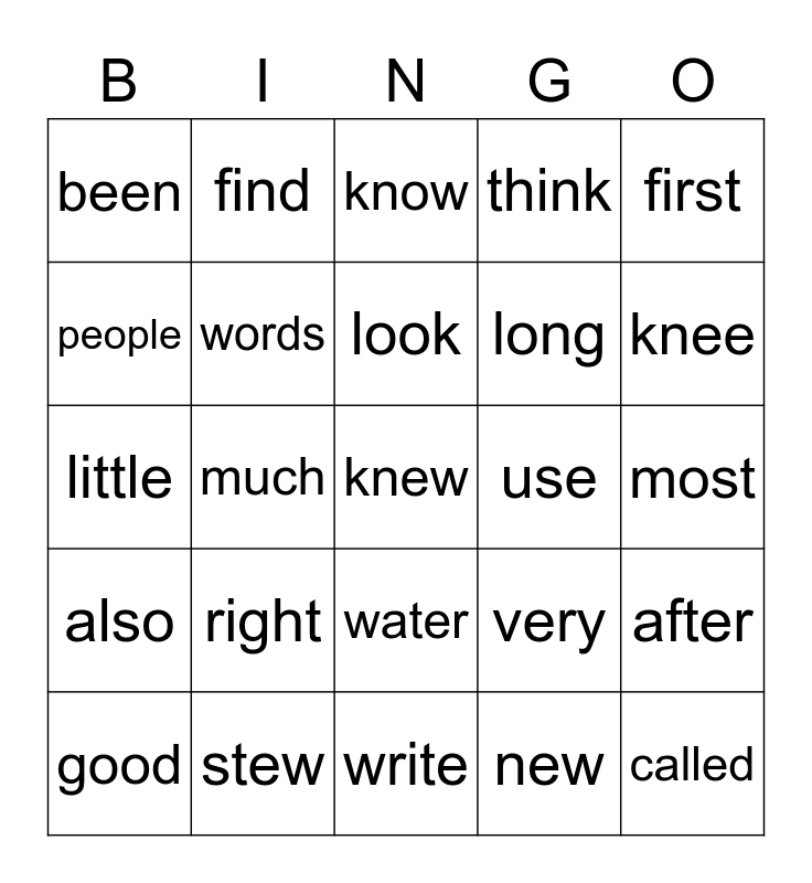 This bingo card has 25 words: right, write, look, good, first, been, people, find, use, water, long, little, very, after, words, called, most, know, knee, much, knew, stew, also, think and new.