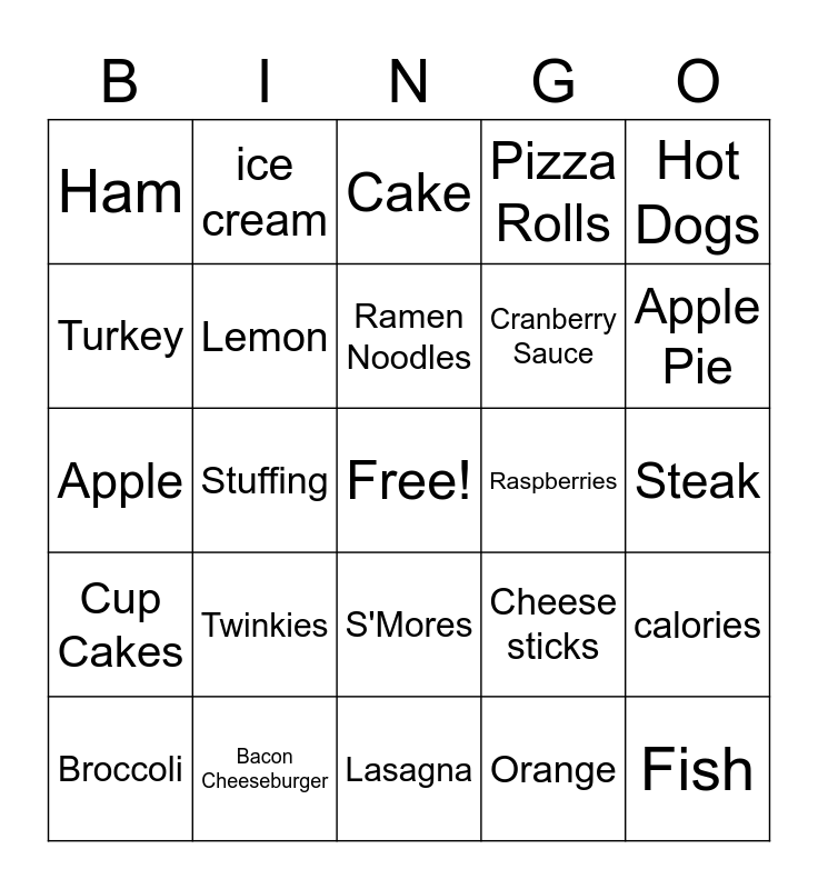 This bingo card has a free space and 66 words: peanut butter, hamburger, Pizza, calories, popsicle, salad, ice cream, Carbs, Ramen Noodles, Brownies, S'Mores, Chicken, Steak, Hot Dogs, Mashed Potatoes, Turkey, Stuffing, Ham, Ding Dongs, Cranberry Sauce, Twinkies, Cup Cakes, Pizza Rolls, Eggs, Pancakes, Bacon, Fries, Chocolate Chip Cookies, Fish, Pumpkin Bread, Broccoli, Gravy, Asparagus, Mozzarella Sticks, Cheese sticks, Bacon Cheeseburger, Grilled Cheese, Apple, Orange, Lime, Lemon, Banana, Raspberries, blueberries, Blackberries, Strawberries, Apple Pie, Pumpkin Pie, Cherry Pie, Chocolate Pie, Carmel Pie, Quesadilla, Tacos, Nachos, Watermelon, Enchiladas, Cinnamon Rolls, Caramel Rolls, Cake, Lasagna, Filet Mignon, Bratwurst, Curry, Macron, Bagel and Mac & Cheese.
