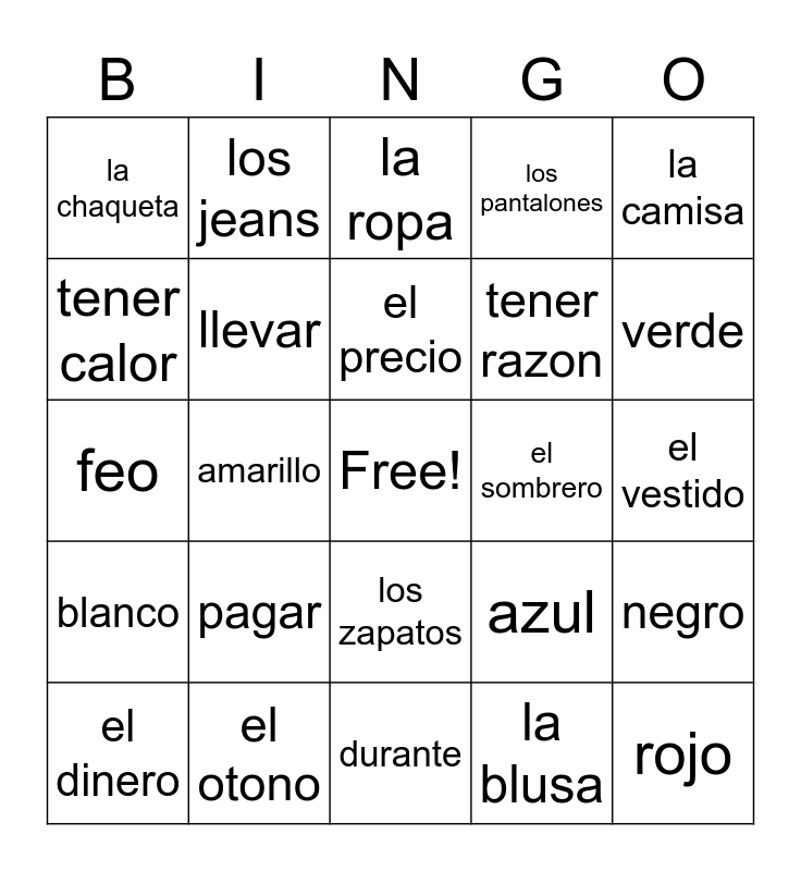 This bingo card has a free space and 24 words: el dinero, pagar, el precio, la blusa, la camisa, la chaqueta, los jeans, la ropa, el sombrero, el vestido, feo, llevar, azul, negro, tener calor, el otono, durante, los pantalones, verde, blanco, amarillo, los zapatos, tener razon and rojo.