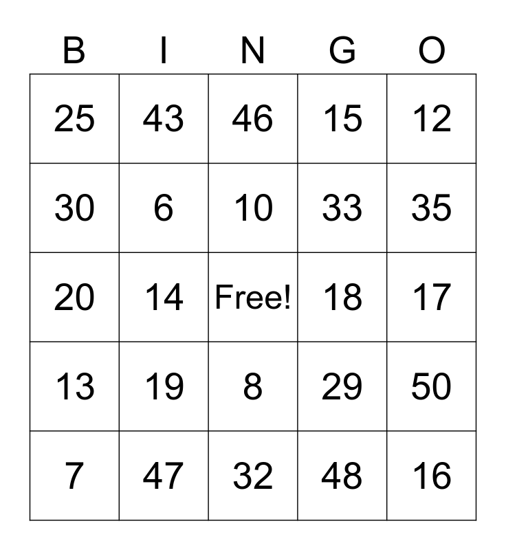 This bingo card has a free space and 39 words: 1, 2, 5, 6, 7, 8, 10, 11, 12, 13, 14, 15, 16, 17, 18, 19, 22, 25, 27, 29, 30, 32, 33, 35, 36, 37, 39, 41, 42, 43, 44, 45, 46, 47, 48, 49, 50, 20 and 4.