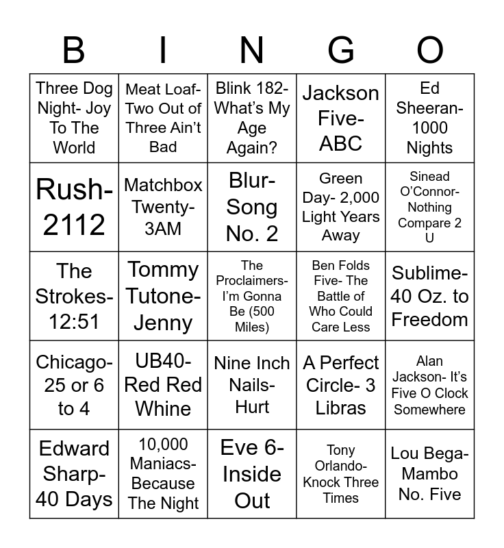 This bingo card has 30 words: 10,000 Maniacs- Because The Night, Fiest- 1,2,3,4, Tommy Tutone- Jenny, 311- Down, Three Dog Night- Joy To The World, Blink 182- What’s My Age Again?, Matchbox Twenty- 3AM, Nine Inch Nails- Hurt, Ben Folds Five- The Battle of Who Could Care Less, Eve 6- Inside Out, Sublime- 40 Oz. to Freedom, The Proclaimers- I’m Gonna Be (500 Miles), Tony Orlando- Knock Three Times, Lou Bega- Mambo No. Five, Sinead O’Connor- Nothing Compare 2 U, Garth Brooks- Two of a Kind, Workin’ On a Full House, A Perfect Circle- 3 Libras, Chicago- 25 or 6 to 4, UB40- Red Red Whine, Ed Sheeran- 1000 Nights, The Strokes- 12:51, Smashing Pumpkins- 1979, Meat Loaf- Two Out of Three Ain’t Bad, Green Day- 2,000 Light Years Away, Rush- 2112, Jackson Five- ABC, Alan Jackson- It’s Five O Clock Somewhere, Edward Sharp- 40 Days, Blur- Song No. 2 and Paul Hardcastle- Nineteen.