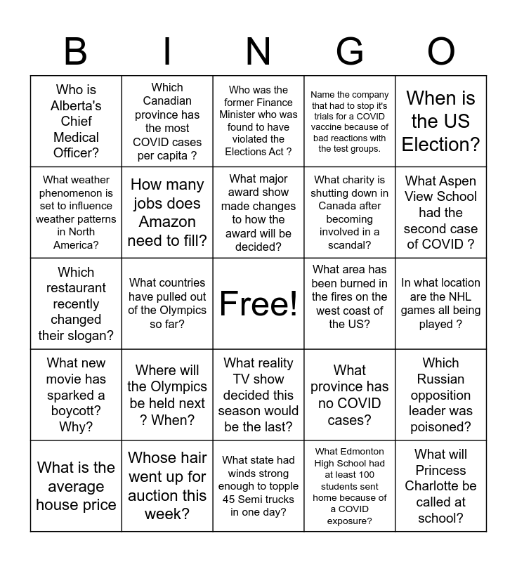 This bingo card has a free space and 24 words: Where will the Olympics be held next ? When?, Whose hair went up for auction this week?, What major award show made changes to how the award will be decided?, What is the average house price, When is the US Election?, Who is Alberta's Chief Medical Officer?, What weather phenomenon is set to influence weather patterns in North America?, Which Canadian province has the most COVID cases per capita ?, What area has been burned in the fires on the west coast of the US?, What reality TV show decided this season would be the last?, What charity is shutting down in Canada after becoming involved in a scandal?, Which restaurant recently changed their slogan?, What province has no COVID cases?, Which Russian opposition leader was poisoned?, How many jobs does Amazon need to fill?, What Edmonton High School had at least 100 students sent home because of a COVID exposure?, In what location are the NHL games all being played ?, Who was the former Finance Minister who was found to have violated the Elections Act ?, What Aspen View School had the second case of COVID ?, What countries have pulled out of the Olympics so far?, What will Princess Charlotte be called at school?, What new movie has sparked a boycott? Why?, Name the company that had to stop it's trials for a COVID vaccine because of bad reactions with the test groups. and What state had winds strong enough to topple 45 Semi trucks in one day?.