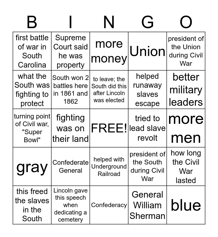 This bingo card has a free space and 24 words: Confederate General, Lincoln gave this speech when dedicating a cemetery, to leave; the South did this after Lincoln was elected, this freed the slaves in the South, president of the Union during Civil War, first battle of war in South Carolina, what the South was fighting to protect, Supreme Court said he was property, tried to lead slave revolt, helped with Underground Railroad, helped runaway slaves escape, turning point of Civil war, "Super Bowl", president of the South during Civil War, how long the Civil War lasted, South won 2 battles here in 1861 and 1862, General William Sherman, more men, more money, better military leaders, fighting was on their land, blue, gray, Union and Confederacy.