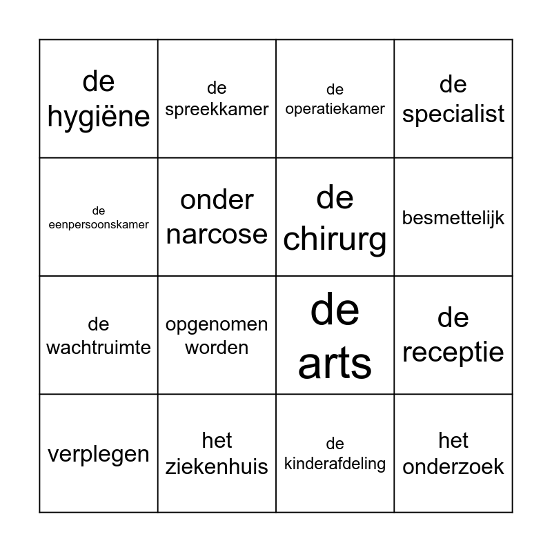 This bingo card has 25 words: aansteken, de apparatuur, besmettelijk, de dagbehandeling, de eenpersoonskamer, de hygiëne, onder narcose, de spreekkamer, het ziekenhuis, de uitslag, de wachtruimte, de arts, het bezoekuur, de breuk, de chirurg, het gips, de kinderafdeling, de operatiekamer, opgenomen worden, de receptie, verplegen, griep, het onderzoek, de specialist and de patiënt.