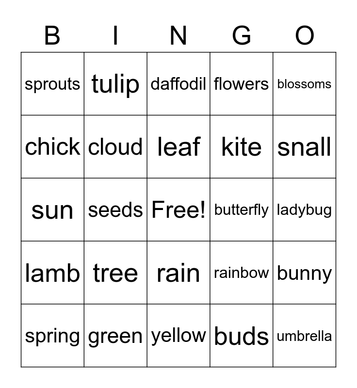 This bingo card has a free space and 24 words: spring, tree, leaf, buds, blossoms, sprouts, tulip, daffodil, butterfly, ladybug, sun, cloud, rainbow, bunny, chick, green, yellow, flowers, snall, lamb, seeds, rain, kite and umbrella.