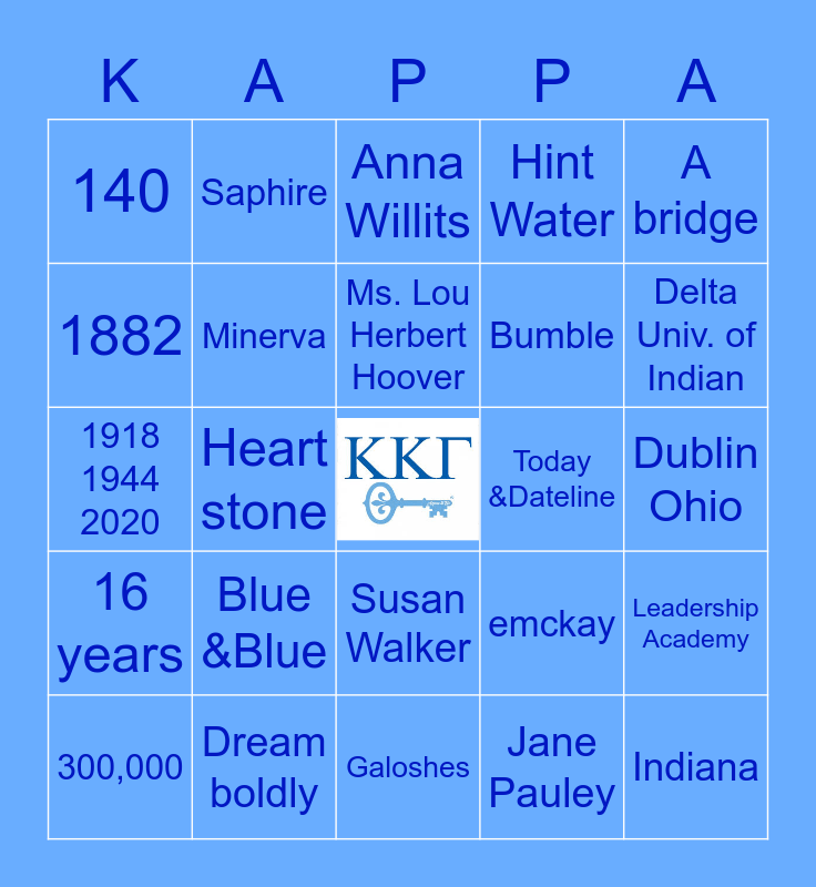 This bingo card has a free space and 52 words: 1870, Blue &Blue, Whitney Wolf Herd, Tinder, Dublin Ohio, Oct.13th 1882, Saphire, Sign the Charter, Bumble, Indiana, 1882, Iris, Kate Spade, Leadership Academy, SIX, Golden Key, Ms. Lou Herbert Hoover, emckay, Florida, 140, Heart stone, Mary Lou Boyd, Hint Water, A bridge, TWO, Dream boldly, Minnie Stewart, Gail Simpson Owen, Delta Univ. of Indian, 16 years, Live Fully, Anna Willits, Gold Medal, NPC, 300,000, Minerva, Susan Walker, Kelley O'Hara, Alum. Achievement Award, 1200, fleur-de-lis, Galoshes, Jane Pauley, Oh Pat, 1918 1944 2020, The Key, Alpha 1, Today &Dateline, Rose McGill, Owl, Mariska Hargitay and A.O.O.