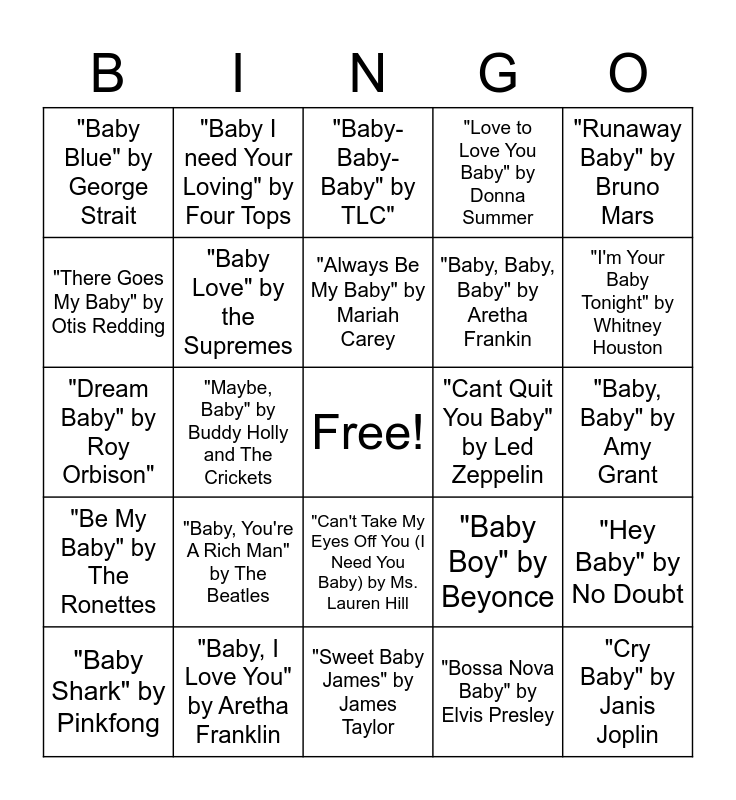 This bingo card has a free space and 36 words: "Baby" by Justin Beiber, "Baby One More Time" by Brittany Spears, "Baby I love Your Ways" by Big Mountain, "Baby Love" by the Supremes, "Baby Boy" by Beyonce, "Be My Baby" by The Ronettes, "Always Be My Baby" by Mariah Carey, "Ice Ice Baby" by Vanilla Ice, "Runaway Baby" by Bruno Mars, "Baby, I love Your Way" by Peter Frampton, "Maybe, Baby" by Buddy Holly and The Crickets, "Love to Love You Baby" by Donna Summer, "Don't Worry, Baby" by The Beach Boys, "Cant Quit You Baby" by Led Zeppelin, "I'm Your Baby Tonight" by Whitney Houston, "Baby Blue" by George Strait, "Baby Grand" by Billy Joel, "Baby, You're A Rich Man" by The Beatles, "Cry Baby" by Janis Joplin, "Baby-Baby-Baby" by TLC", "Baby, Baby" by Amy Grant, "Hey Baby" by No Doubt, "Baby, I Love You" by Aretha Franklin, "Baby Shark" by Pinkfong, "Sweet Baby James" by James Taylor, "Baby I need Your Loving" by Four Tops, "Dream Baby" by Roy Orbison", "Baby, Baby, Baby" by Joss Stone, "Baby, Baby, Baby" by Aretha Frankin, "There Goes My Baby" by Otis Redding, "Ooo Baby, Baby" by Smokey Robinson and The Miracles, "Since I Lost My Baby" by The Temptations, "Bossa Nova Baby" by Elvis Presley, "Can't Take My Eyes Off You (I Need You Baby) by Ms. Lauren Hill, "Baby Hold On" bby Eddie Money and "Rock Me Baby" by B. B. King and Eric Clapton.
