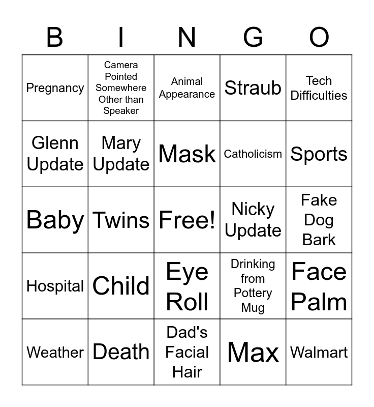 This bingo card has a free space and 24 words: Child, Death, Mask, Weather, Tech Difficulties, Pregnancy, Glenn Update, Camera Pointed Somewhere Other than Speaker, Nicky Update, Eye Roll, Catholicism, Baby, Drinking from Pottery Mug, Face Palm, Mary Update, Max, Fake Dog Bark, Animal Appearance, Sports, Twins, Walmart, Hospital, Straub and Dad's Facial Hair.
