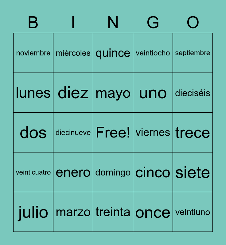 This bingo card has a free space and 24 words: enero, marzo, mayo, julio, septiembre, noviembre, lunes, miércoles, viernes, domingo, uno, dos, cinco, siete, diez, once, trece, quince, dieciséis, diecinueve, veintiuno, veinticuatro, veintiocho and treinta.