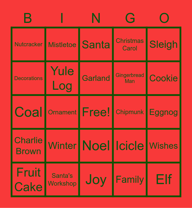 This bingo card has a free space and 75 words: snow, snowman, Santa, Mr. Claus, Grinch, Bells, Bow, Ribbon, Presents, Icicles, Christmas Tree, Wreath, Garland, Decorations, Lights, Ornament, Stocking, Elf, Reindeer, Sleigh, Toys, Coal, Yule Log, Mistletoe, Christmas Carol, Scrooge, Frosty, Jack Frost, Turkey, 25th, Naughty List, Nice List, Cards, Icicle, Cookie, Gingerbread Man, Gingerbread House, Candy Cane, Eggnog, Family, Holly, North Pole, Shopping, Sales, Sugar Plums, Figgie Pudding, Fruit Cake, Nutcracker, Tinsel, Wrapping Paper, Cheer, Noel, Holiday, Whoville, Poinsettia, Winter, Chimney, Fireplace, Candles, Dreidel, Winter, Snowflake, Miracle, Peppermint, Santa's Bag, Chipmunk, Feliz Navidad, Merry Christmas, Rudolph, Wishes, Charlie Brown, Santa's Workshop, Hot Cocoa, Joy and Peace.