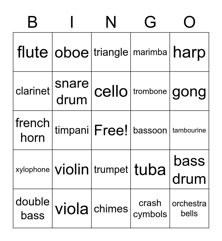This bingo card has a free space and 24 words: violin, viola, cello, double bass, harp, flute, clarinet, oboe, bassoon, trumpet, trombone, french horn, tuba, bass drum, snare drum, crash cymbols, tambourine, triangle, gong, timpani, orchestra bells, xylophone, marimba and chimes.