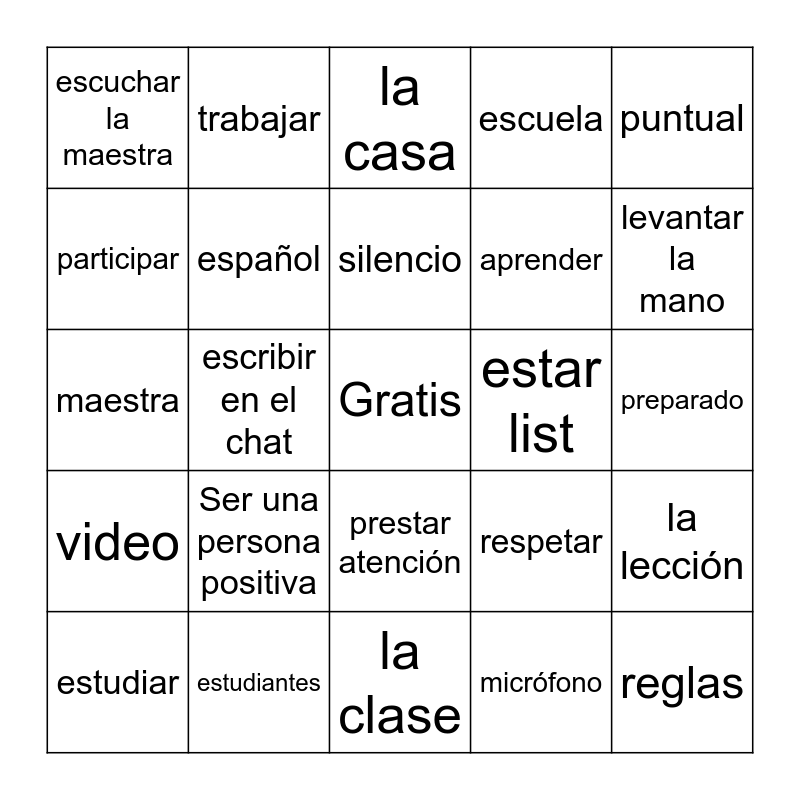 This bingo card has a free space and 24 words: Ser una persona positiva, estudiantes, silencio, estudiar, puntual, escuchar la maestra, participar, trabajar, estar list, prestar atención, aprender, maestra, respetar, la lección, español, micrófono, preparado, la casa, levantar la mano, escribir en el chat, reglas, video, escuela and la clase.