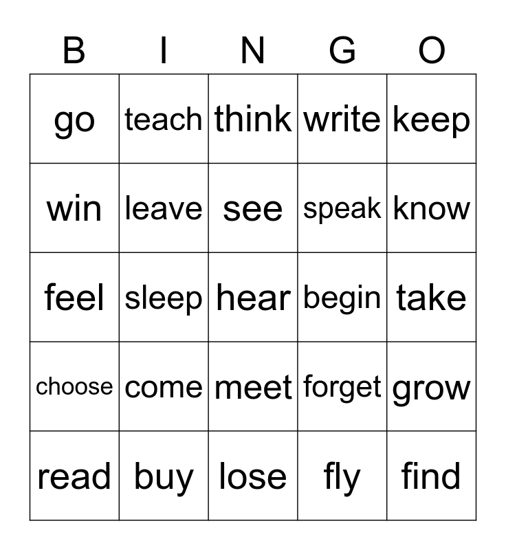 This bingo card has a free space and 24 words: come, buy, see, read, keep, go, win, teach, begin, meet, speak, feel, forget, grow, leave, fly, take, think, know, sleep, find, choose, write and lose.