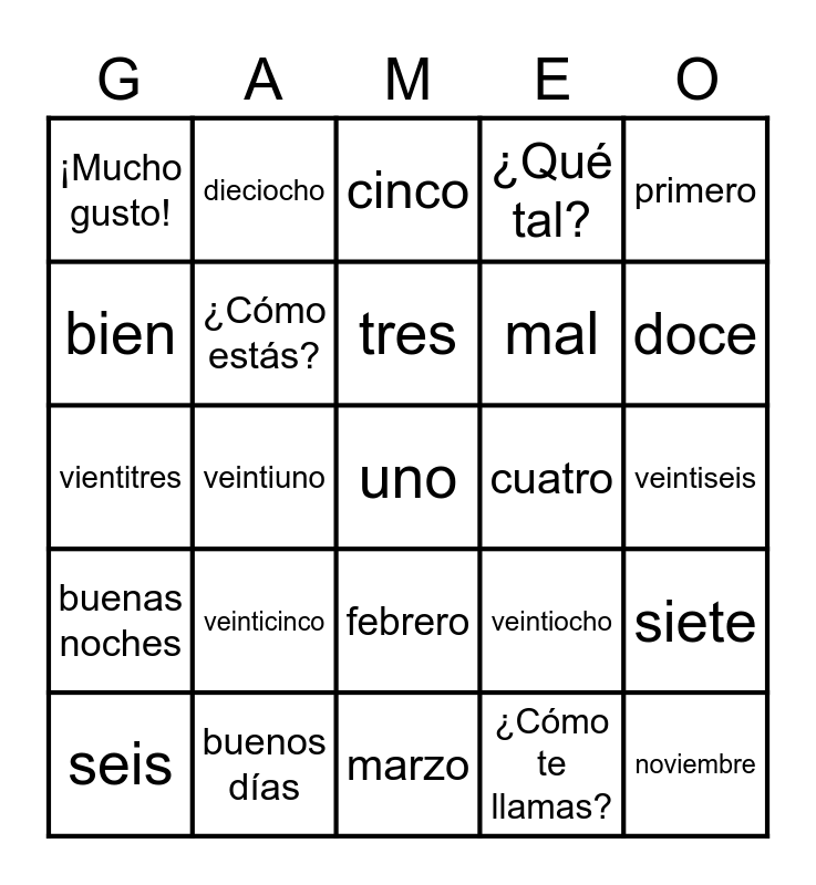 This bingo card has 60 words: hola, buenos días, buenas tardes, buenas noches, ¿Cómo te llamas?, Me llamo..., ¿Cómo estás?, Yo estoy..., mal, más o menos, ¿Qué tal?, adiós, bien, chao, hasta luego, ¡Mucho gusto!, uno, primero, dos, tres, cuatro, cinco, seis, siete, ocho, nueve, diez, once, doce, trece, catorce, quince, dieciseis, diecisiete, dieciocho, diecinueve, veinte, veintiuno, veintidos, vientitres, veinticuatro, veinticinco, veintiseis, veintisiete, veintiocho, veintinueve, treinta, treinta y uno, enero, febrero, marzo, abril, mayo, junio, julio, agosto, septiembre, octubre, noviembre and diciembre.