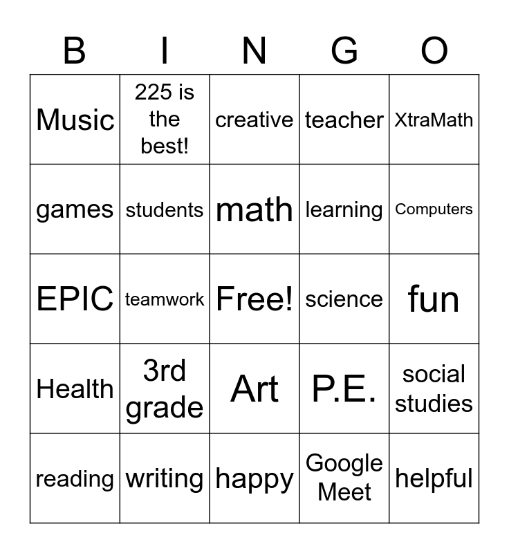 This bingo card has a free space and 24 words: 3rd grade, writing, math, reading, XtraMath, Music, games, 225 is the best!, science, Art, learning, EPIC, P.E., social studies, students, Google Meet, fun, creative, Computers, teamwork, helpful, Health, teacher and happy.