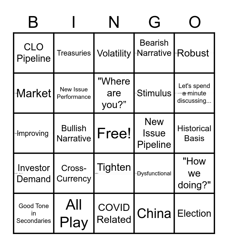 This bingo card has 12 images, a free space and 29 words: Good Tone in Secondaries, Shrugging Off, Bullish Narrative, Technical, CLO Pipeline, Volatility, New Issue Performance, Cross-Currency, New Issue Pipeline, All Play, Historical Basis, Election, COVID Related, China, Let's spend a minute discussing..., Take it to the bank, Tighten, Investor Demand, Robust, Improving, Dysfunctional, The FED, Stimulus, Market, Bearish Narrative, Treasuries, "How we doing?", "Where are you?” and "Your hair looks great".