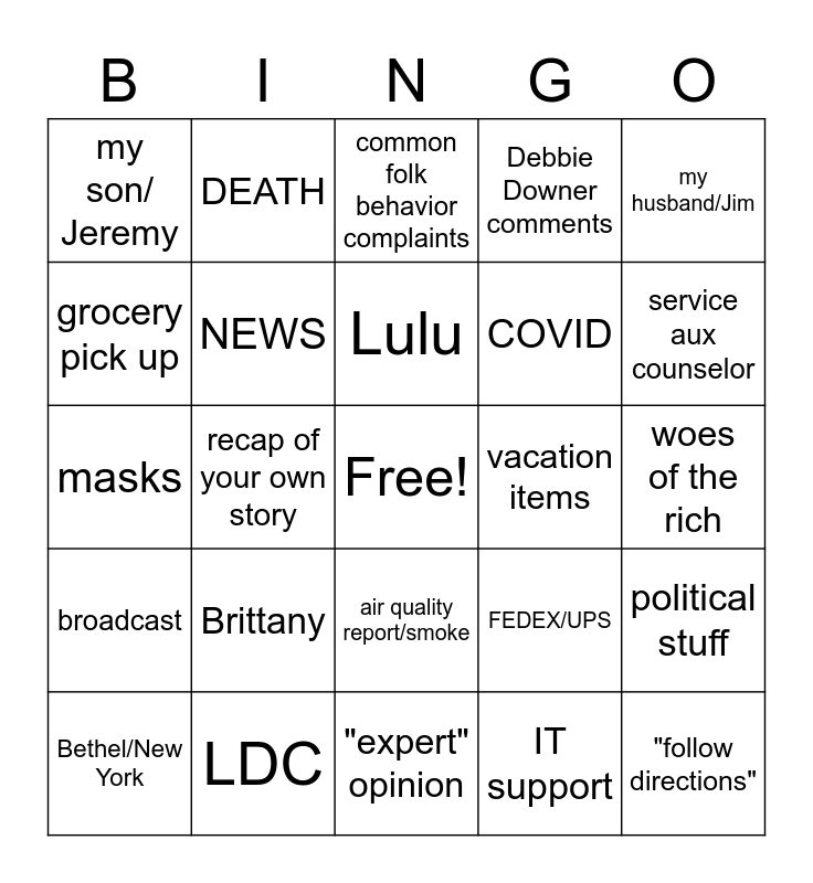 This bingo card has a free space and 24 words: Brittany, LDC, Lulu, Bethel/New York, my husband/Jim, my son/ Jeremy, grocery pick up, DEATH, vacation items, air quality report/smoke, COVID, masks, FEDEX/UPS, political stuff, NEWS, IT support, woes of the rich, common folk behavior complaints, service aux counselor, recap of your own story, "follow directions", broadcast, Debbie Downer comments and "expert" opinion.