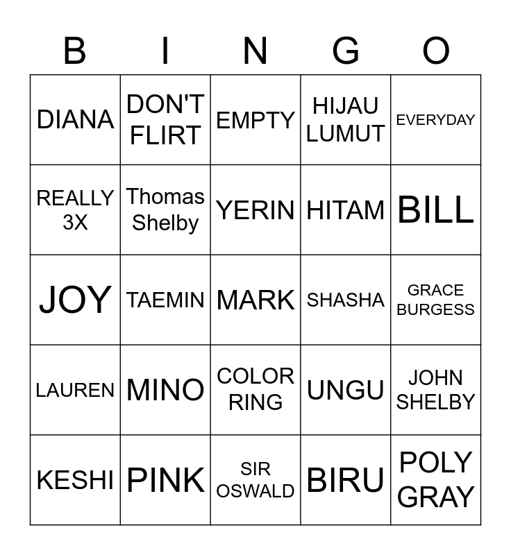 This bingo card has a free space and 24 words: MINO, PINK, YERIN, KESHI, EVERYDAY, DIANA, REALLY 3X, DON'T FLIRT, SHASHA, COLOR RING, HITAM, JOY, UNGU, JOHN SHELBY, Thomas Shelby, BIRU, GRACE BURGESS, EMPTY, BILL, TAEMIN, POLY GRAY, LAUREN, HIJAU LUMUT and SIR OSWALD.