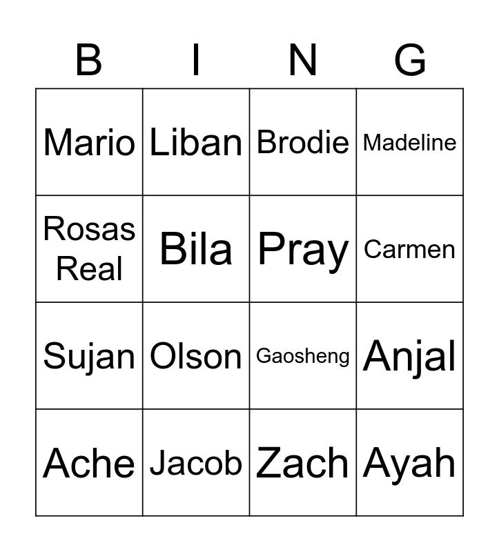 This bingo card has 20 words: Anjal, Mustafa, Brodie, Indya, Ache, Rosas Real, Jacob, Mario, Sujan, Liban, Olson, Gaosheng, Bila, Ayah, Pray, Andrea, Carmen, Madeline, Zach and Xiong.