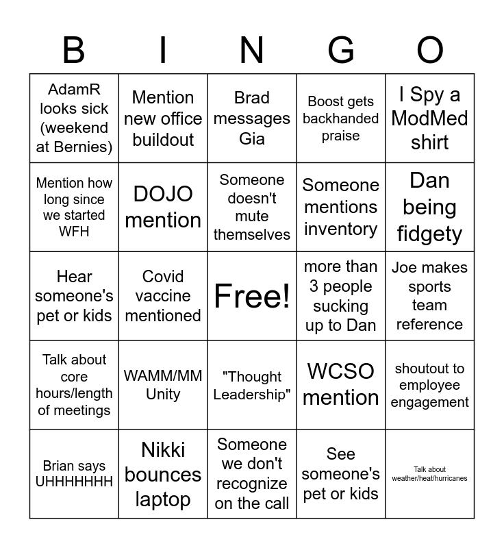 This bingo card has a free space and 24 words: WAMM/MM Unity, Nikki bounces laptop, Someone doesn't mute themselves, Brian says UHHHHHHH, I Spy a ModMed shirt, AdamR looks sick (weekend at Bernies), Mention how long since we started WFH, Mention new office buildout, more than 3 people sucking up to Dan, "Thought Leadership", Someone mentions inventory, Hear someone's pet or kids, WCSO mention, shoutout to employee engagement, DOJO mention, See someone's pet or kids, Joe makes sports team reference, Brad messages Gia, Dan being fidgety, Covid vaccine mentioned, Talk about weather/heat/hurricanes, Talk about core hours/length of meetings, Boost gets backhanded praise and Someone we don't recognize on the call.