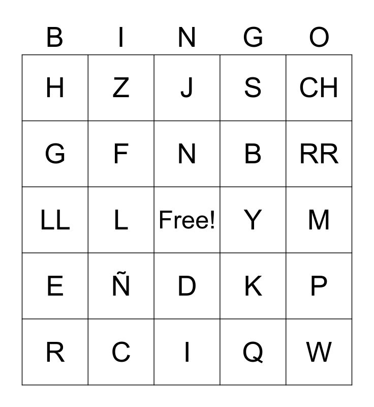 This bingo card has a free space and 24 words: Ñ, C, N, R, CH, H, G, Z, Y, D, B, LL, K, P, F, Q, M, J, RR, L, W, E, S and I.