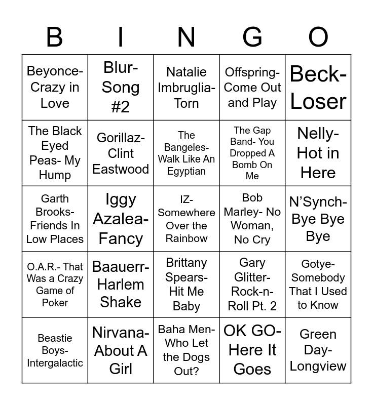 This bingo card has 25 words: Baauerr- Harlem Shake, Baha Men- Who Let the Dogs Out?, The Bangeles- Walk Like An Egyptian, Beastie Boys- Intergalactic, Beck- Loser, Beyonce- Crazy in Love, The Black Eyed Peas- My Hump, Blur- Song #2, Bob Marley- No Woman, No Cry, Brittany Spears- Hit Me Baby, The Gap Band- You Dropped A Bomb On Me, Garth Brooks- Friends In Low Places, Gary Glitter- Rock-n-Roll Pt. 2, Gotye- Somebody That I Used to Know, Gorillaz- Clint Eastwood, Green Day- Longview, N’Synch- Bye Bye Bye, Natalie Imbruglia- Torn, Nelly- Hot in Here, Iggy Azalea- Fancy, IZ- Somewhere Over the Rainbow, Nirvana- About A Girl, O.A.R.- That Was a Crazy Game of Poker, Offspring- Come Out and Play and OK GO- Here It Goes.