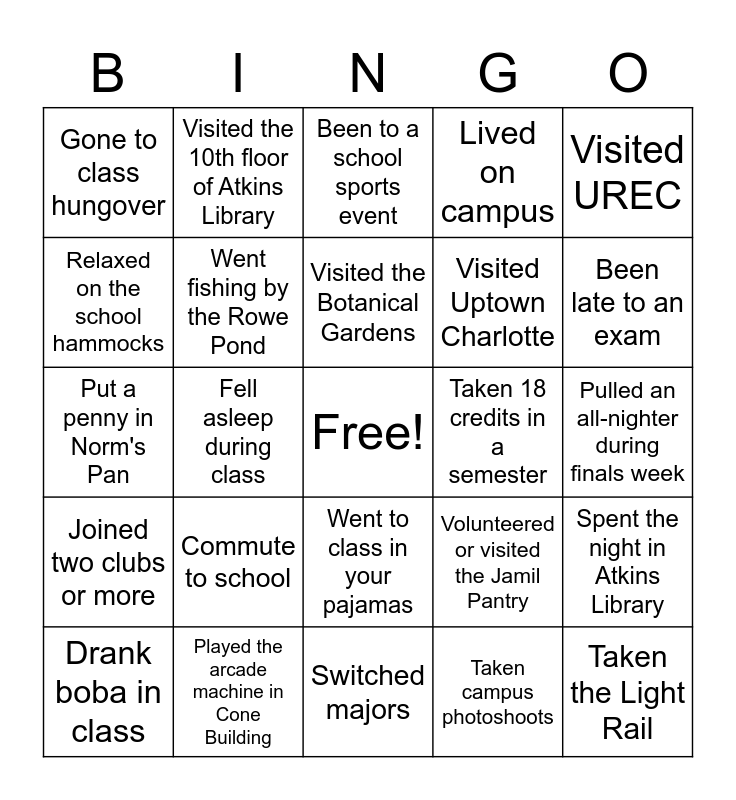 This bingo card has a free space and 24 words: Commute to school, Played the arcade machine in Cone Building, Visited the Botanical Gardens, Drank boba in class, Visited UREC, Gone to class hungover, Relaxed on the school hammocks, Visited the 10th floor of Atkins Library, Taken 18 credits in a semester, Went to class in your pajamas, Visited Uptown Charlotte, Put a penny in Norm's Pan, Volunteered or visited the Jamil Pantry, Spent the night in Atkins Library, Went fishing by the Rowe Pond, Taken campus photoshoots, Pulled an all-nighter during finals week, Been to a school sports event, Been late to an exam, Fell asleep during class, Taken the Light Rail, Joined two clubs or more, Lived on campus and Switched majors.