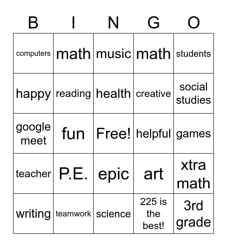 This bingo card has a free space and 24 words: P.E., teamwork, health, writing, students, computers, happy, math, helpful, epic, creative, google meet, art, xtra math, reading, 225 is the best!, games, music, social studies, fun, 3rd grade, teacher, math and science.