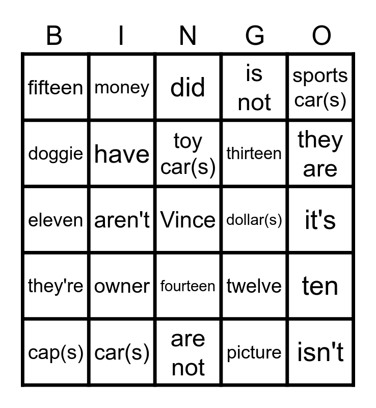 This bingo card has a free space and 24 words: owner, car(s), toy car(s), cap(s), sports car(s), fifteen, doggie, money, dollar(s), fourteen, thirteen, eleven, twelve, ten, have, picture, it's, did, they are, aren't, isn't, they're, is not and are not.