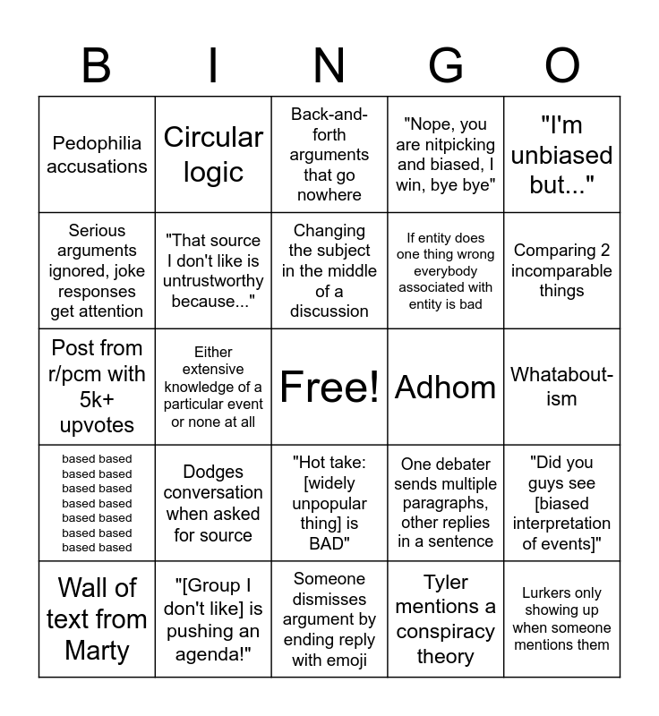 This bingo card has a free space and 24 words: Wall of text from Marty, Dodges conversation when asked for source, Changing the subject in the middle of a discussion, Tyler mentions a conspiracy theory, "I'm unbiased but...", Pedophilia accusations, Circular logic, Back-and-forth arguments that go nowhere, Adhom, Whatabout-ism, Post from r/pcm with 5k+ upvotes, "That source I don't like is untrustworthy because...", One debater sends multiple paragraphs, other replies in a sentence, "Did you guys see [biased interpretation of events]", Serious arguments ignored, joke responses get attention, "[Group I don't like] is pushing an agenda!", Someone dismisses argument by ending reply with emoji, "Nope, you are nitpicking and biased, I win, bye bye", Comparing 2 incomparable things, based based based based based based based based based based based based based based, Either extensive knowledge of a particular event or none at all, "Hot take: [widely unpopular thing] is BAD", If entity does one thing wrong everybody associated with entity is bad and Lurkers only showing up when someone mentions them.