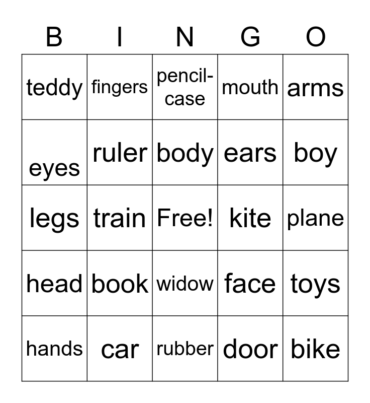 This bingo card has a free space and 29 words: hands, doll, train, puzzle, teddy, pencil- case, ruler, book, kite, car, plane, bike, rubber, door, boy, girl, widow, head, arms, legs, face, nose, ears, eyes, mouth, fingers, toys, body and school.