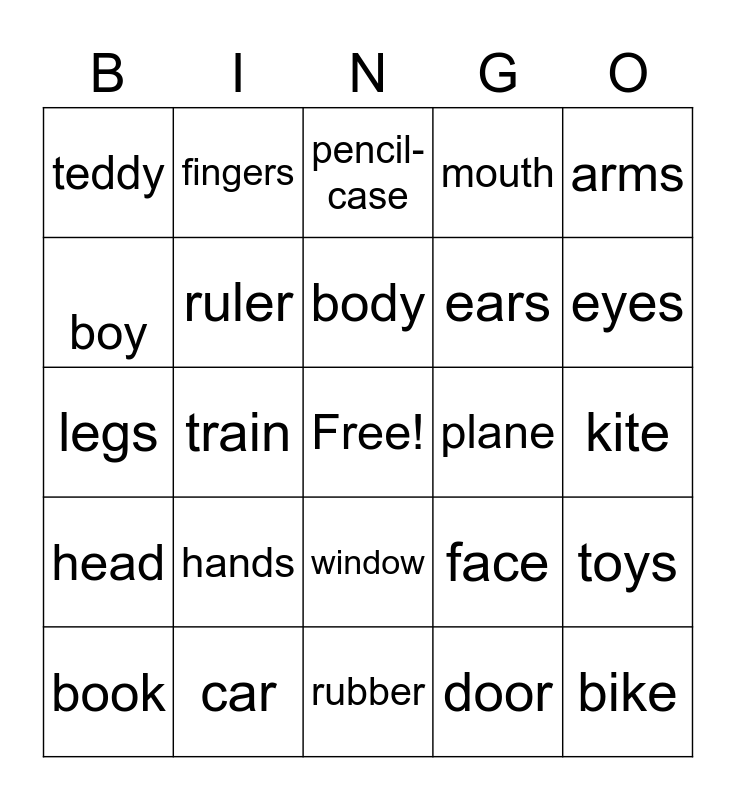 This bingo card has a free space and 29 words: book, doll, train, puzzle, teddy, pencil- case, ruler, hands, plane, car, kite, bike, rubber, door, eyes, girl, window, head, arms, legs, face, nose, ears, boy, mouth, fingers, toys, body and school.