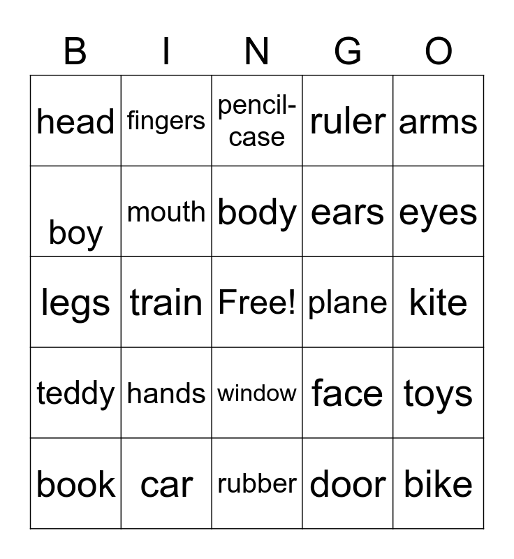 This bingo card has a free space and 29 words: book, doll, train, puzzle, head, pencil- case, mouth, hands, plane, car, kite, bike, rubber, door, eyes, girl, window, teddy, arms, legs, face, nose, ears, boy, ruler, fingers, toys, body and school.