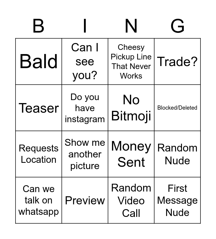 This bingo card has 16 words: Preview, Random Nude, Cheesy Pickup Line That Never Works, Bald, Requests Location, Can I see you?, Money Sent, Random Video Call, Teaser, Do you have instagram, Can we talk on whatsapp, Trade?, Show me another picture, Blocked/Deleted, No Bitmoji and First Message Nude.