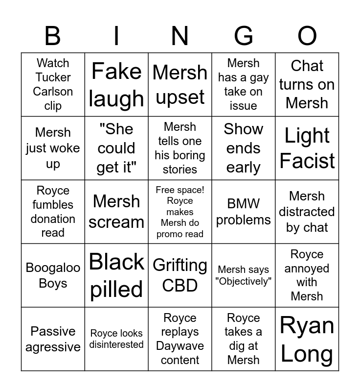 This bingo card has a free space and 24 words: Black pilled, Royce looks disinterested, Mersh tells one his boring stories, Passive agressive, Chat turns on Mersh, Watch Tucker Carlson clip, Mersh just woke up, Fake laugh, BMW problems, Grifting CBD, Show ends early, Royce fumbles donation read, Mersh says "Objectively", Royce annoyed with Mersh, "She could get it", Royce takes a dig at Mersh, Mersh distracted by chat, Mersh upset, Light Facist, Mersh scream, Ryan Long, Boogaloo Boys, Mersh has a gay take on issue and Royce replays Daywave content.