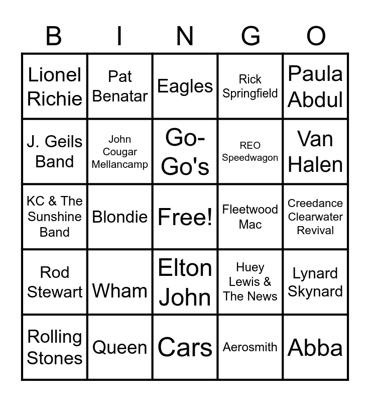 This bingo card has a free space and 24 words: Wham, Queen, Go-Go's, Rolling Stones, Paula Abdul, Lionel Richie, J. Geils Band, Pat Benatar, Fleetwood Mac, Elton John, REO Speedwagon, KC & The Sunshine Band, Huey Lewis & The News, Lynard Skynard, John Cougar Mellancamp, Aerosmith, Creedance Clearwater Revival, Eagles, Van Halen, Blondie, Abba, Rod Stewart, Rick Springfield and Cars.