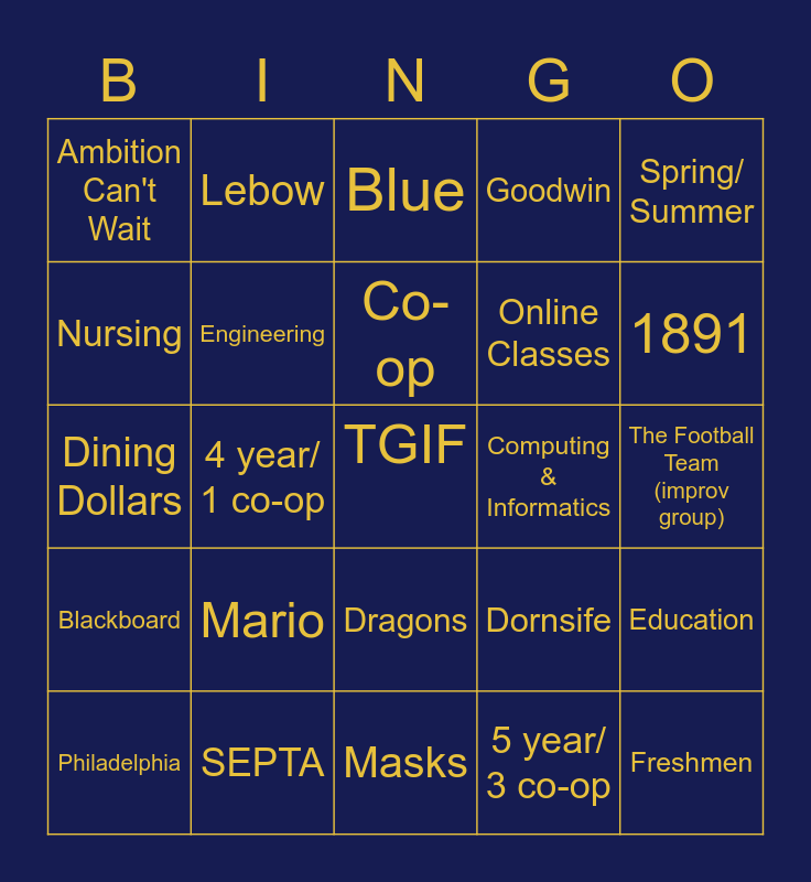 This bingo card has a free space and 49 words: First Bash, Freshmen, Drexel, Masks, Mario, Welcome Week, Lebow, Westphal, Nursing, Pennoni, Engineering, Goodwin, Education, Dornsife, Entrepreneurship, Arts & Science, Co-op, Computing & Informatics, Fall/ Winter, Spring/ Summer, 4 year/ 1 co-op, 5 year/ 3 co-op, Ambition Can't Wait, Online Classes, John Fry, 1891, Philadelphia, Pennsylvania, Dragons, Blackboard, DrexelOne, Anthony J Drexel, Outlook, Zoom, SEPTA, Only 1 summer, Quarter System, Center City, The Football Team (improv group), FAFSA, Philadelphia Cream Cheese, Philly Cheesesteak, Dragon Dollars, Handschumacher Dining Center, Dining Dollars, Blue, Yellow, Coronavirus and D1.