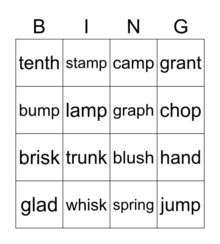 This bingo card has 20 words: glad, frog, camp, hand, spent, trunk, spring, grant, brisk, stamp, blush, chop, tenth, whisk, graph, drop, bump, lamp, stand and jump.