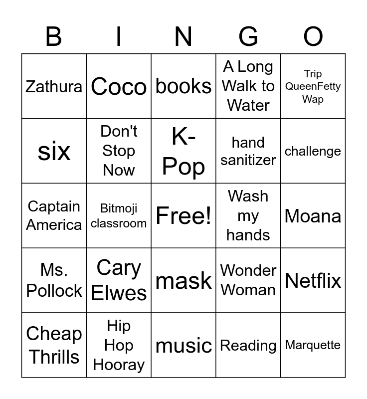 This bingo card has a free space and 24 words: Cary Elwes, Hip Hop Hooray, K-Pop, Cheap Thrills, Trip QueenFetty Wap, Zathura, six, Coco, Wash my hands, mask, hand sanitizer, Captain America, Wonder Woman, Netflix, Don't Stop Now, Reading, Moana, books, challenge, Bitmoji classroom, Marquette, Ms. Pollock, A Long Walk to Water and music.
