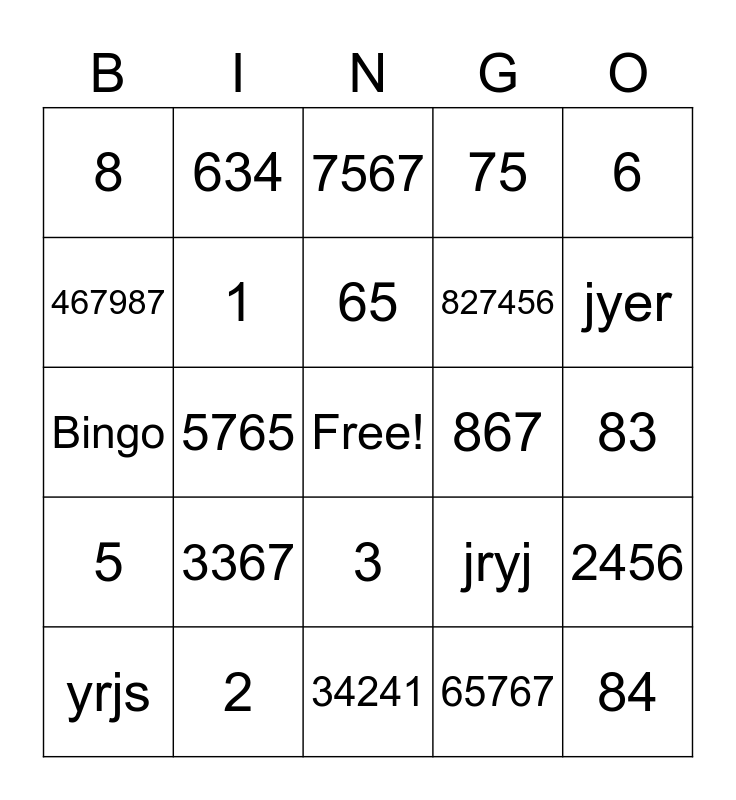 This bingo card has a free space and 40 words: Test, Bingo, Card, 1, 2, 3, 65, 4, 6, 5, 5765, 75, 84, 83, 867, 3367, 386, 8, 387, 7567, 2456, 65767, 827456, 467987, 76, fjni, dsaoij, sd, hgd, hfs, sfhjy, yrjs, rjy, jryj, jyer, 34241, 135, 643, 634 and 13416.